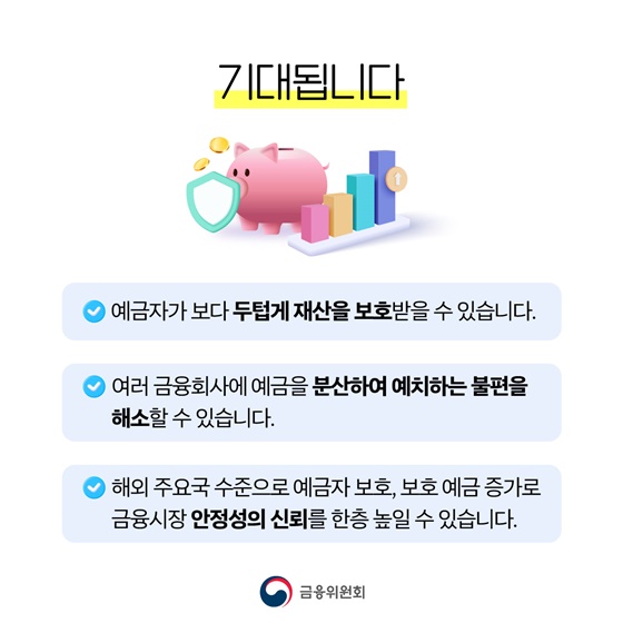 ▶ 보호한도가 1억 원으로 늘어나면서 심리적 안정감 확보 및 이자율이 높은 금융기관 활용의 폭이 넓어집니다.